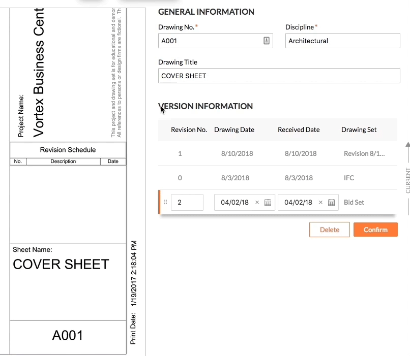 - Versões: as versões são ordenadas de acordo com o campo Data da planta, mas você pode usar uma operação de arrastar e soltar para colocar a versão que está enviando por upload em uma ordem diferente.